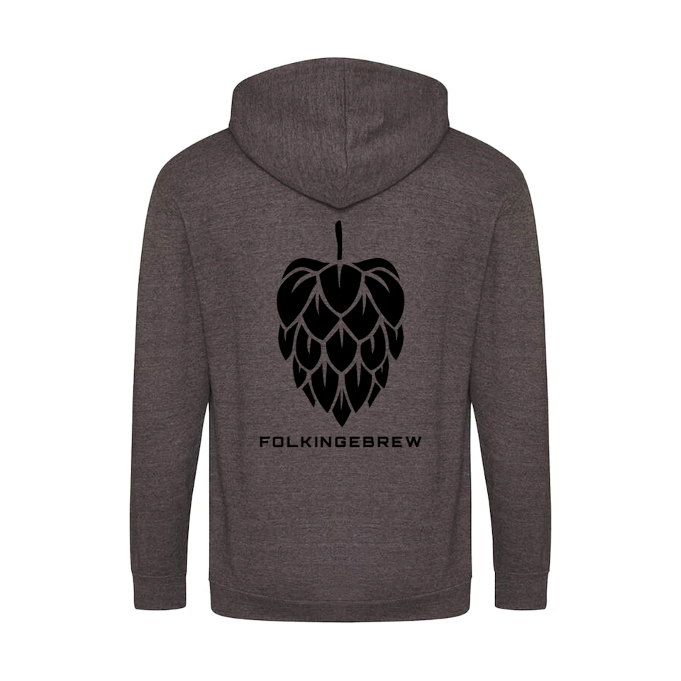 Charcoal Zipped Hoodie with small black Folkingebrew logo on the front and our full logo on the back.